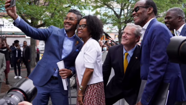 About 200 people joined Governor Charlie Baker and Acting Mayor Kim Janey in Roxbury’s Nubian Square Friday evening for One Night in Boston, a festive event that kicked off a weekend of Juneteenth festivities